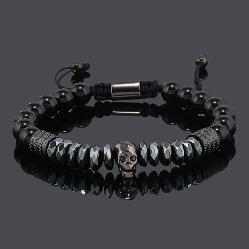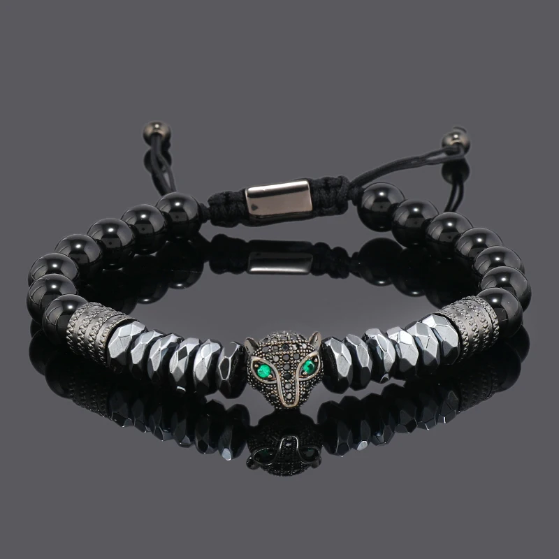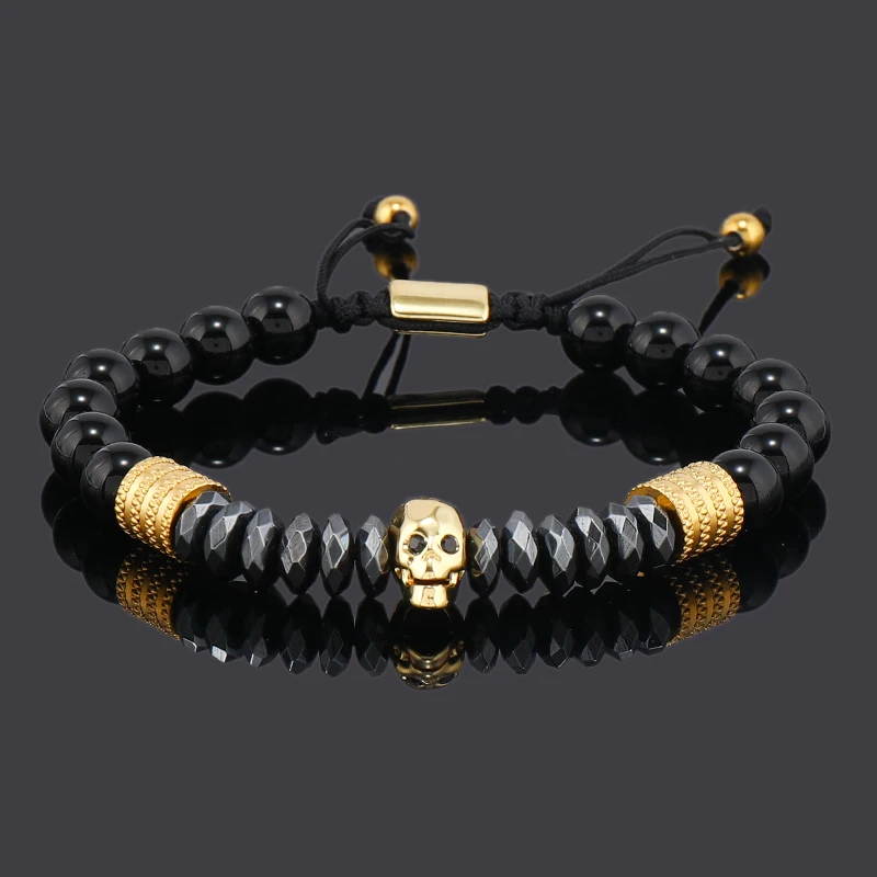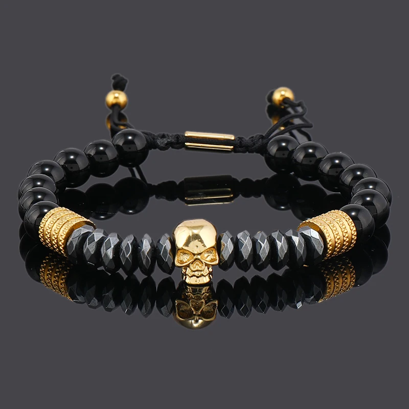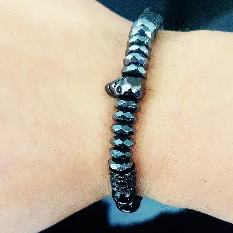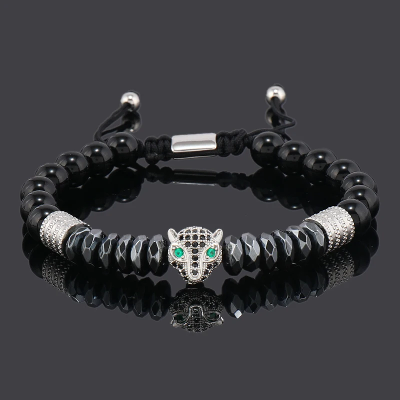 Luxury Black Natural Stone Beads Skull Crown Leopard Head Charms Man Bracelet For Women Hand Jewelry Gift