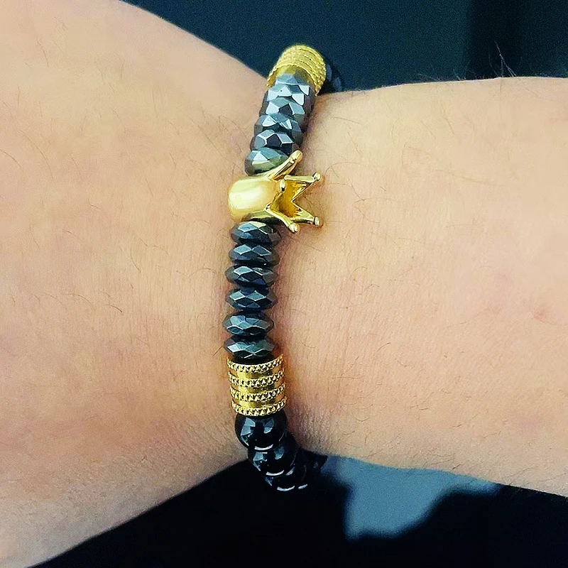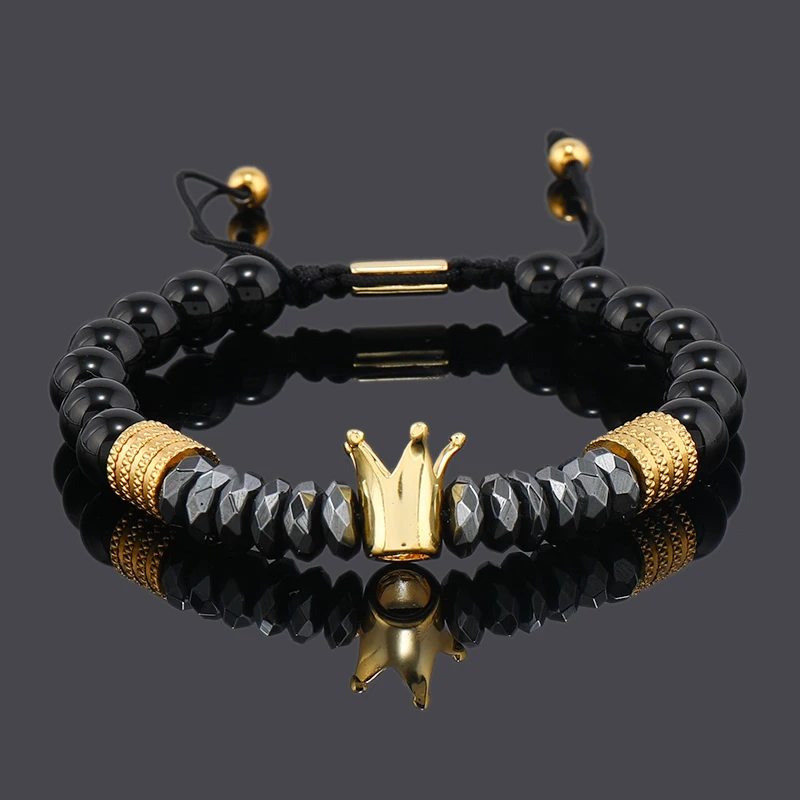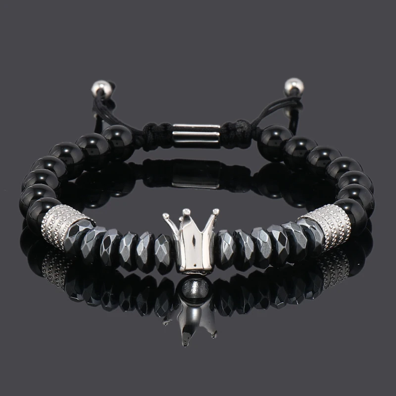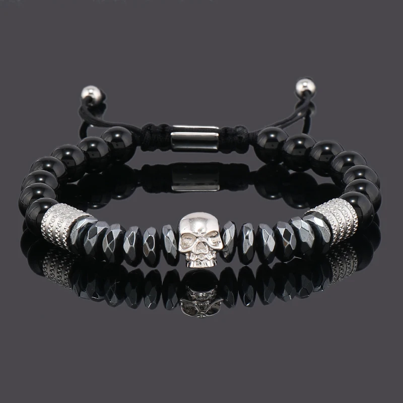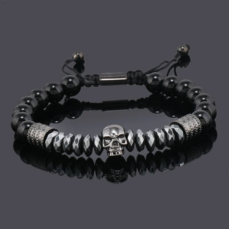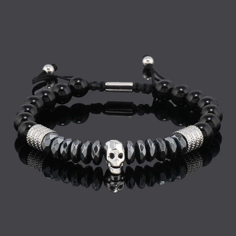 Luxury Black Natural Stone Beads Skull Crown Leopard Head Charms Man Bracelet For Women Hand Jewelry Gift